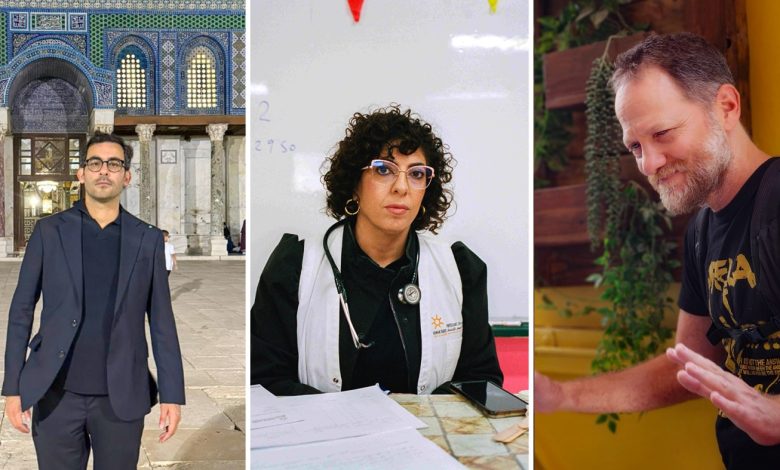 From left: Yousef Bashir, who as a teen was shot by an Israeli soldier in Gaza and nearly paralyzed;  Dr. Lina Qasem Hassan, an Israeli Palestinian who is chair of Physicians for Human Rights-Israel, a group that advocates for the health of Jews and Palestinians alike; and Maoz Inon, whose parents died in the Hamas attack of Oct. 7.