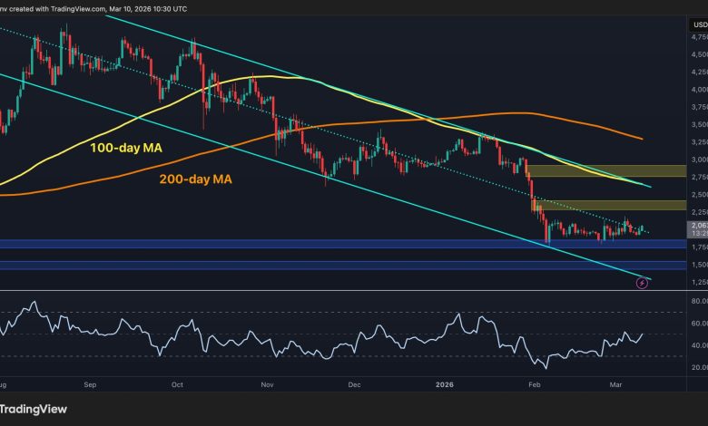 On the daily chart, ETH remains below the 100-day and 200-day moving averages, which keeps the higher timeframe trend tilted to the downside. The asset is also still trading inside a descending channel, while the $2,400 and $2,800 zones continue to act as the main resistance barriers on any larger rebound.